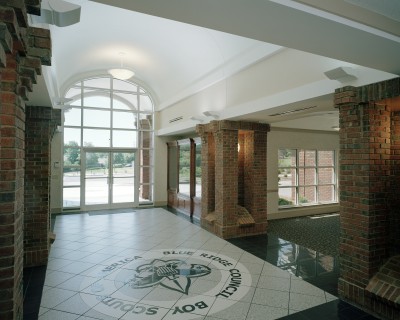 Exterior entrance sidewalks show Scout Ranks and Scout Law embedded in concrete.